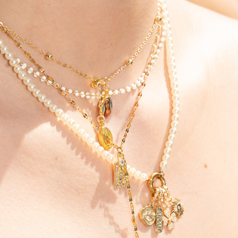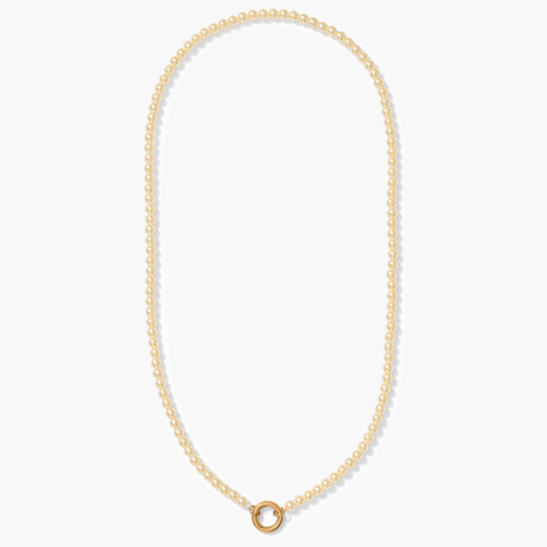 The Pearl Charm Chain Strand features a fine chain accented with delicate pearls and finished with a front ring closure, designed to hold your favorite charms or be worn on its own. Light-catching and easy to style, it adds a softer element to your stack while still feeling effortless.