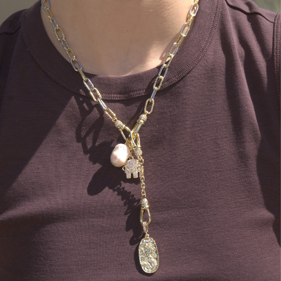 Crafted in alternating silver and gold-filled textured chain, this piece features a front-facing pavé swivel clasp designed to hold your favorite charms. Wear it solo or personalize it with meaning. A foundation for your story.