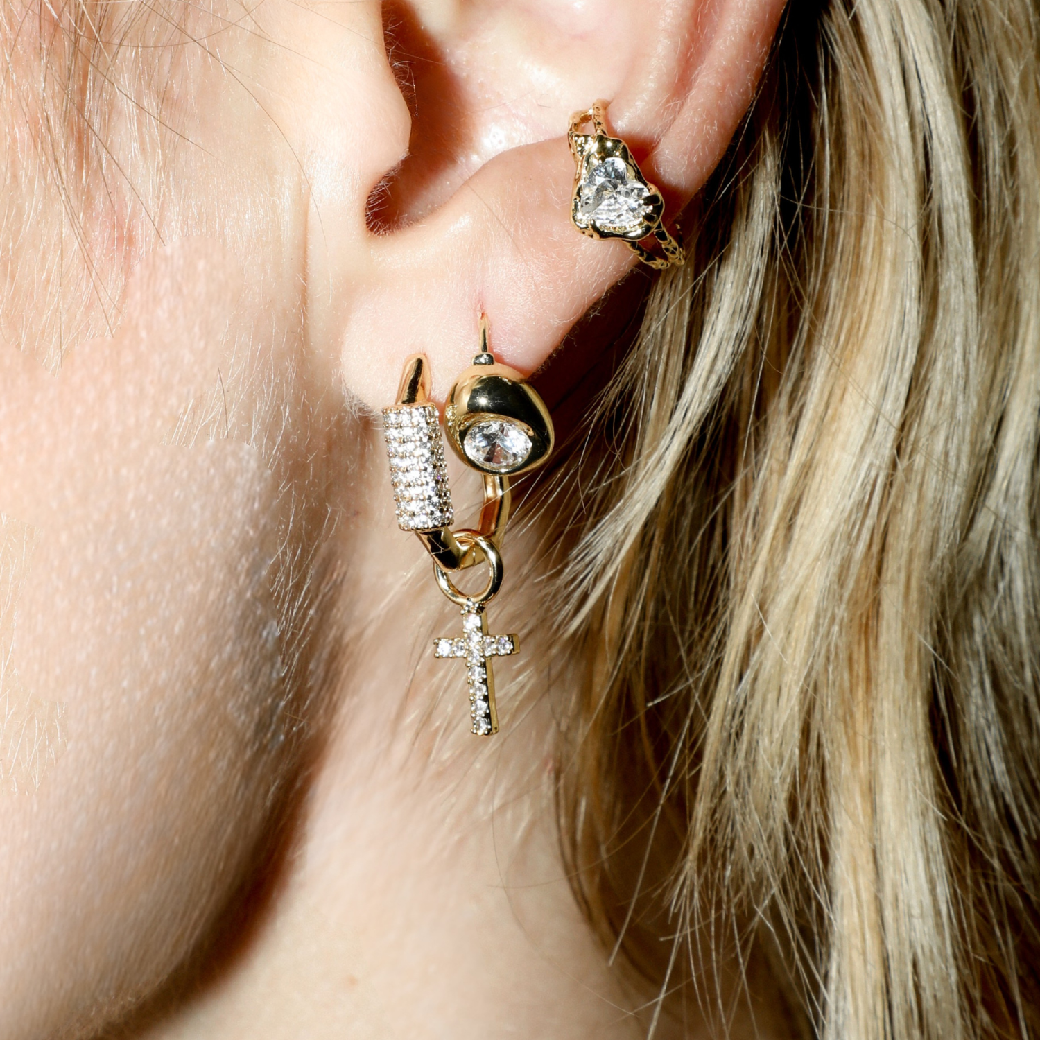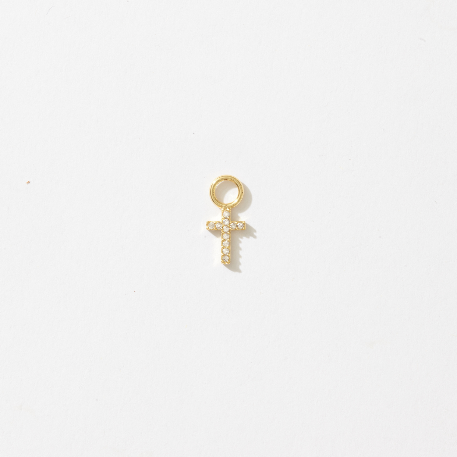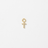 Classic and luminous, the Divina Cross Huggie Hoop Charm captures the quiet strength of devotion and light. Each arm is lined with hand-set pavé crystals that shimmer with intention, creating a piece that feels both sacred and modern. Designed to slip onto a favorite huggie or hoop, it’s a golden reminder of faith, protection, and enduring beauty.