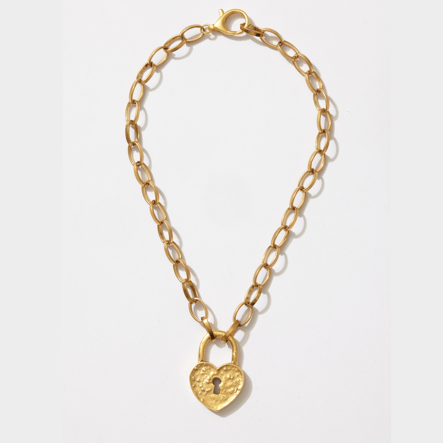 A vintage heart-shaped padlock meets a textured rope-link chain in this bold-yet-romantic piece. The Heartlock Twist Necklace evokes stories of hidden love and keys yet to be found, crafted in a rich gold finish that feels both ancient and iconic. Wear it close, layered, or solo—this one holds.