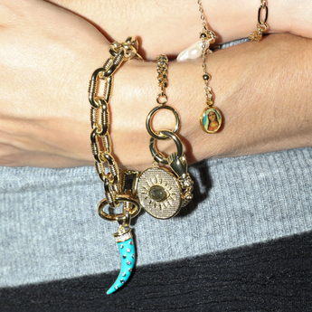 The Evil Eye, a potent talisman against negative energies, takes center stage with meticulous detailing, casting a watchful gaze of safeguarding energy. Labradorite is often associated with transformation and change. Labradorite energy may support in navigating transitions on a manifestation journey. Whether worn as a standalone statement or layered with other talisman companions, this medallion becomes a symbolic guardian amulet, guiding you with its protective gaze through the cosmic energies.