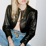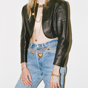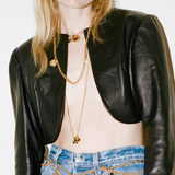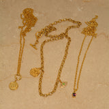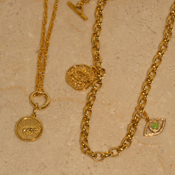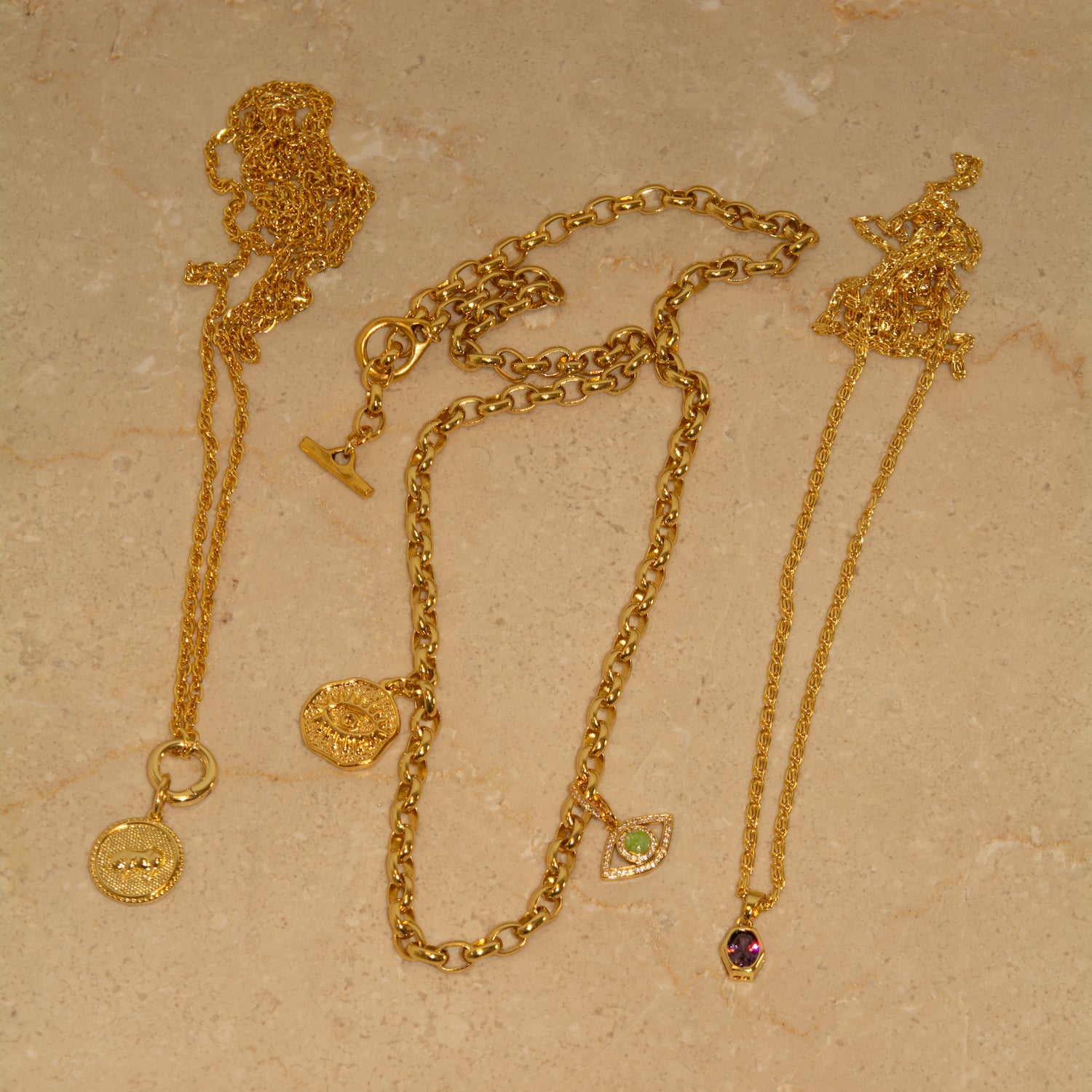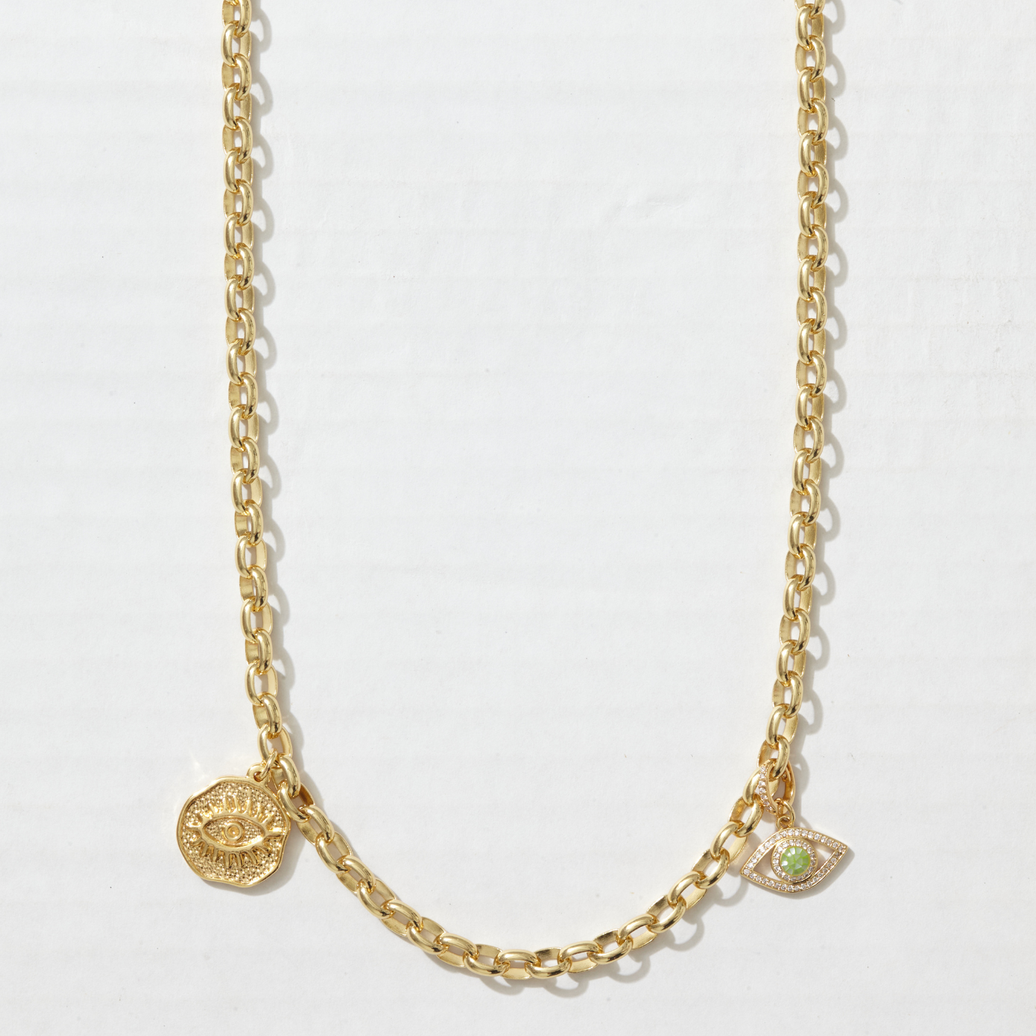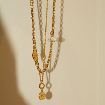 Two eyes, one intention. A textured eye-coin on the left is mirrored with its pavé eyed protector on the right, with a soft green opal center and sitting on our elongated gold-filled link Gaia chain. Clean, protective, and made to layer. Wear it solo for a quiet glow or stack it with your everyday rolos for that Alexie reverie.