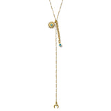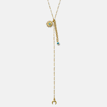 A golden cascade of cosmic symbols—sunburst eye, crescent moon, and watchful eye—anchored on alternating chains on a 14K Gold filled white enamel ball chain. and vintage-inspired links.