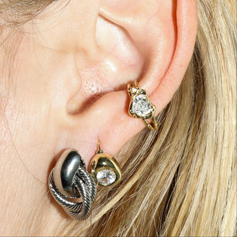 A pair designed to shine in every phase, our Astrea Drop Huggies feature a fluid, modern silhouette that cradles a brilliant center CZ stone. Their rounded form is inspired by the soft lines. Wear them as your everyday signature for a quiet glow or pair them with statement pieces to build a look charged with personal energy.