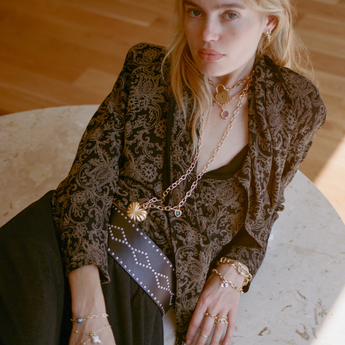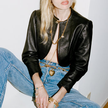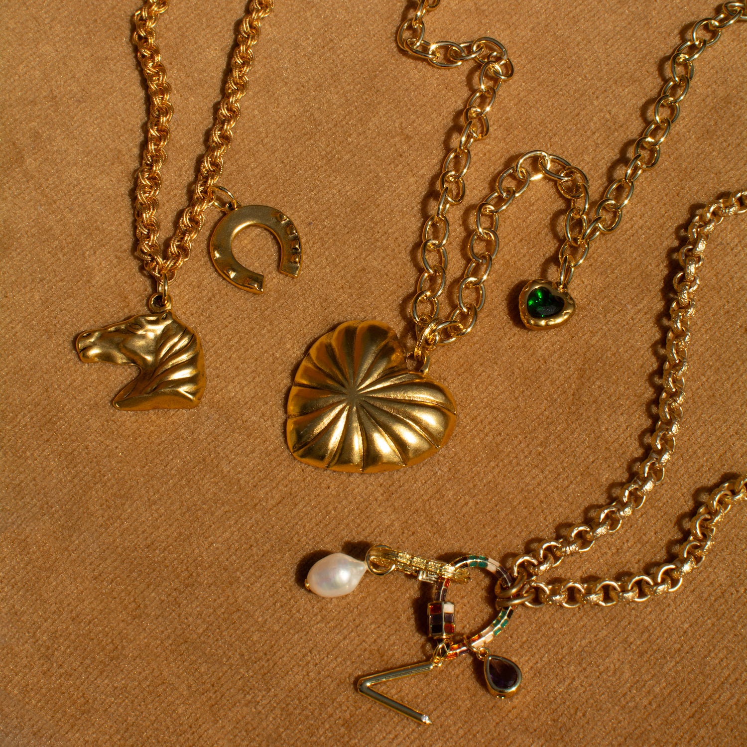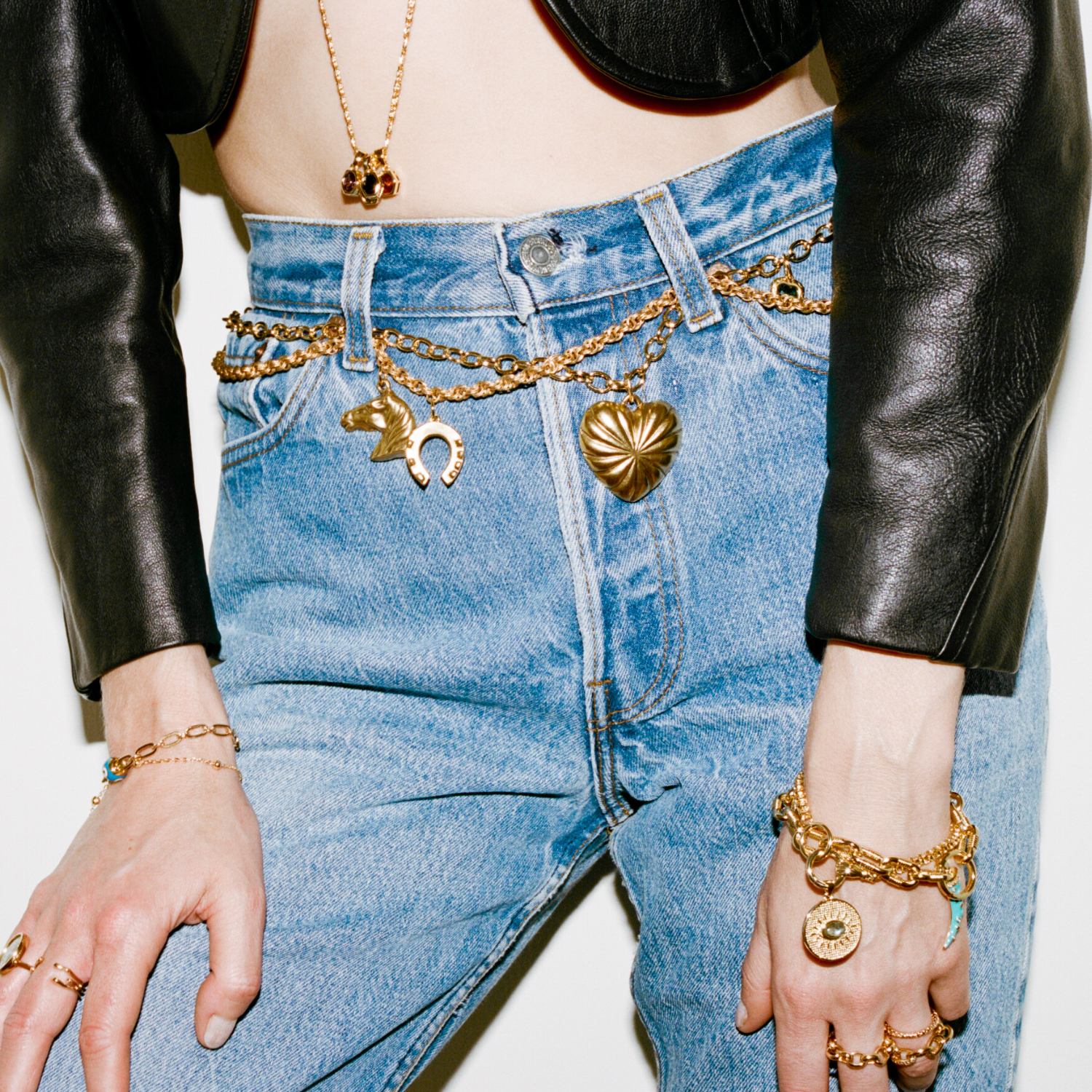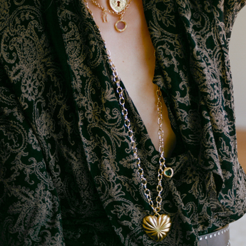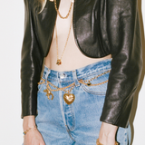 Meet our Cherie Convertible Heart Wrap Necklace and Belt Chain. There are endless ways to make it yours. Wear it long, doubled, or as a chain belt. An extra-long gold link chain finished with a fluted heirloom heart and a petite etched emerald heart.