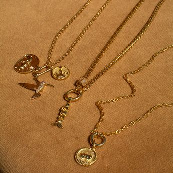 A vintage-inspired fish charm that moves with you, each segment articulated like it just slipped off a sun-kissed line in the Aegean. The Lido Golden Fish Charm is a golden nod to seaside summers, good luck legends, and playful protection. Adorned with a tiny pop of green at the eye, she’s a talisman for dreamers who know when to swim upstream.