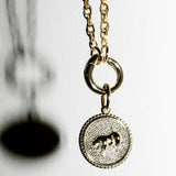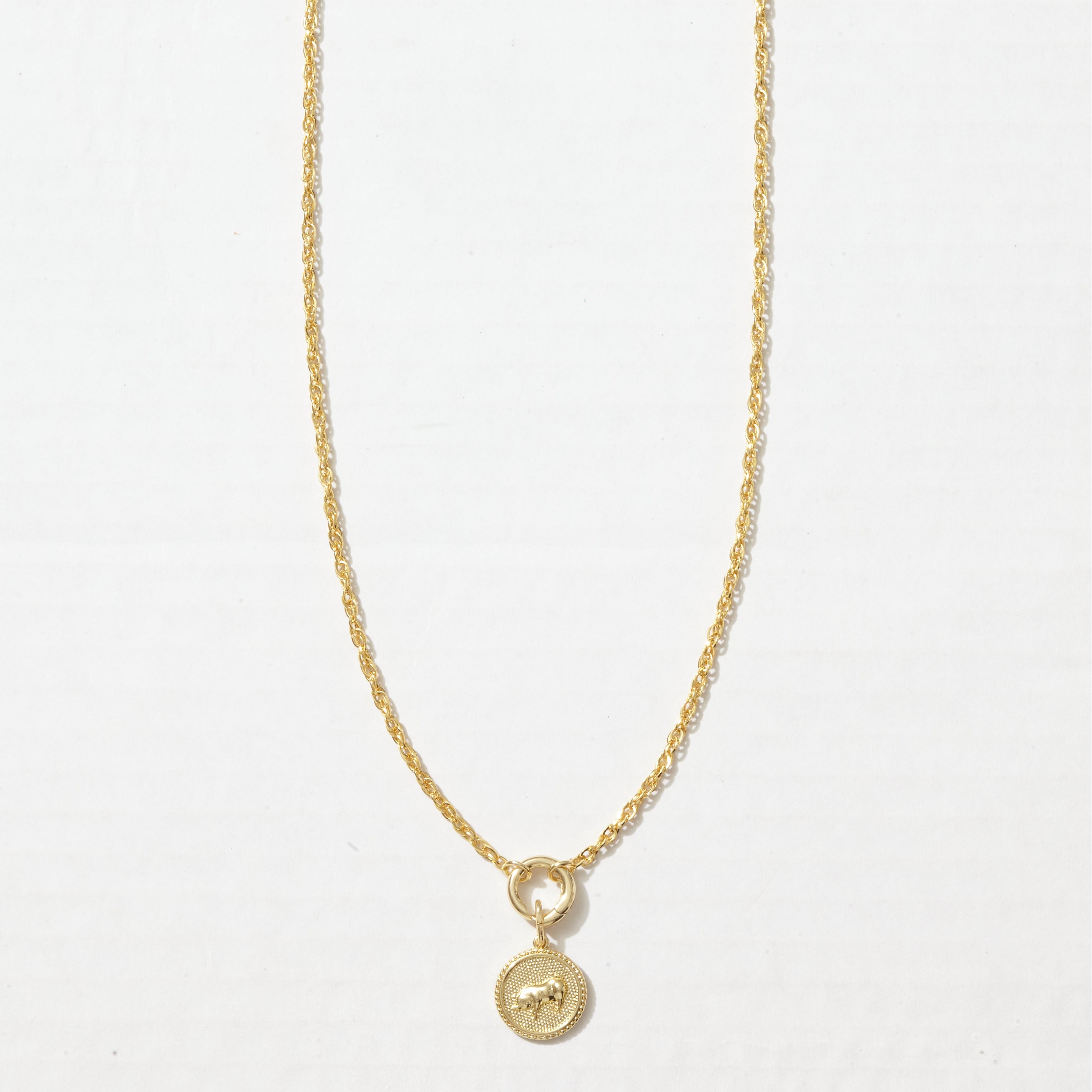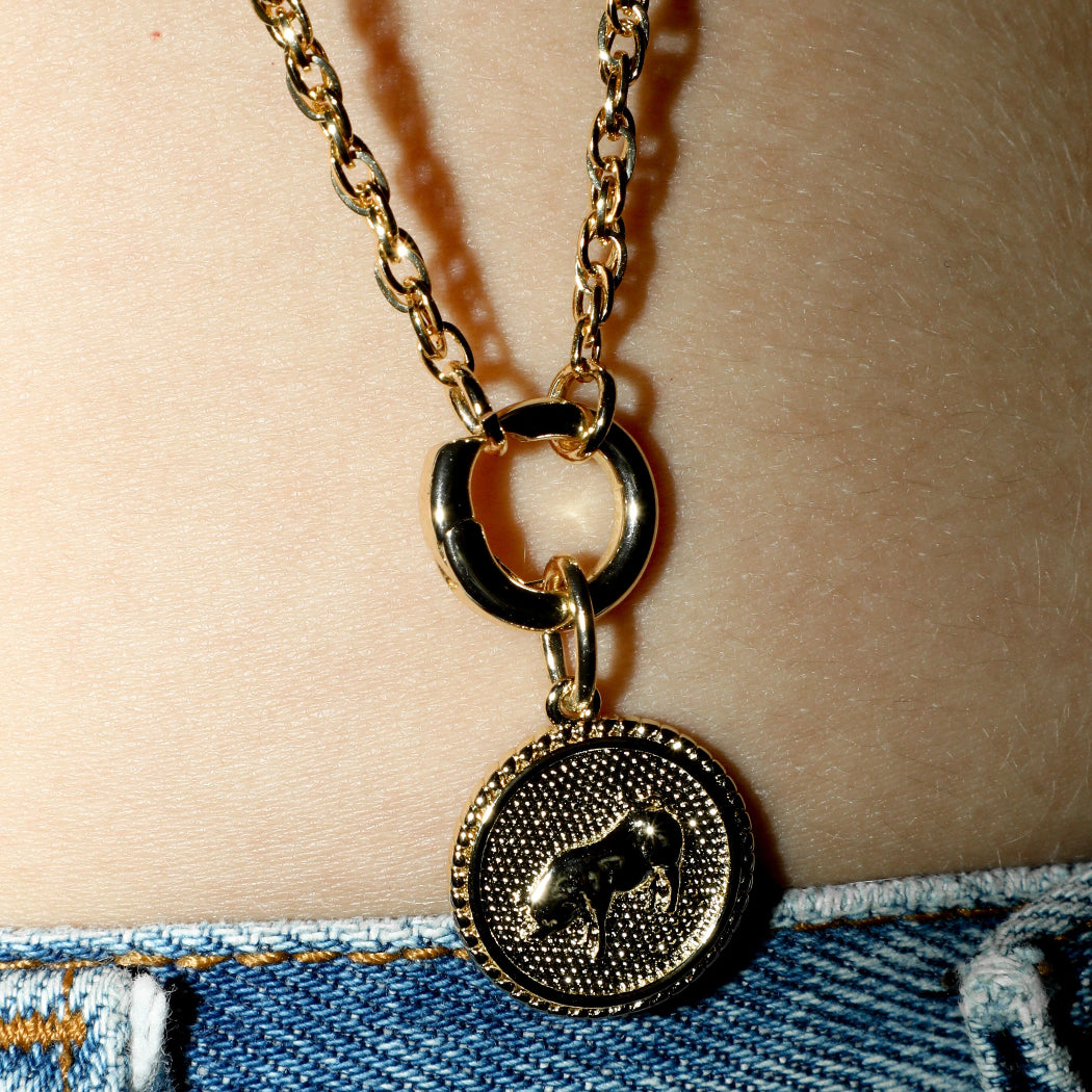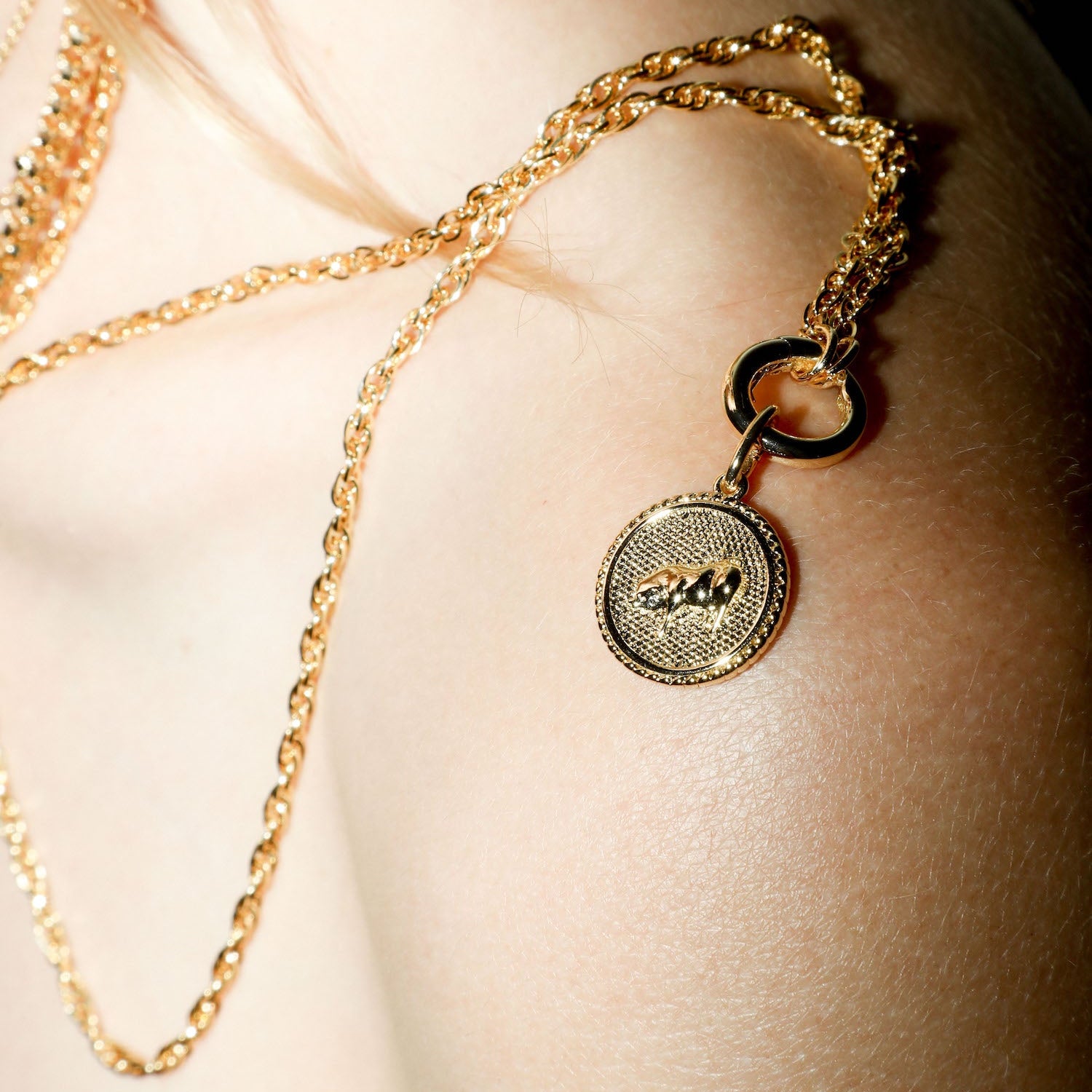 The Lunar Long Chain Medallion Necklace is more than jewelry, it is a talisman made to carry your story. A flowing long Rolo chain that can be double wrapped catches the light with every movement, a gold lunar zodiac medallion charm marks your sign, attached by a circle push clasp connector that lets you easily stack more charms to curate this chain completely of your own frequency. Layer it, wrap it, stack it, and let it become a chain as unique as you.