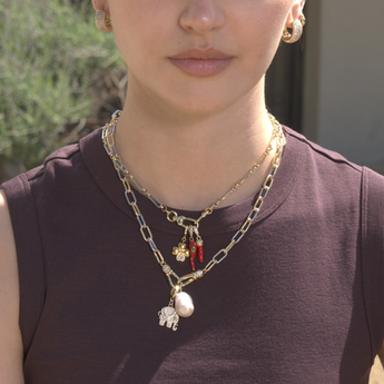 Each charm features a one-of-a-kind freshwater baroque pearl suspended from a polished gold loop. The organic shape gives it that perfectly imperfect glow that feels collected, personal, and a little undone. An easy charm that brings a little glow to your everyday layers.