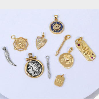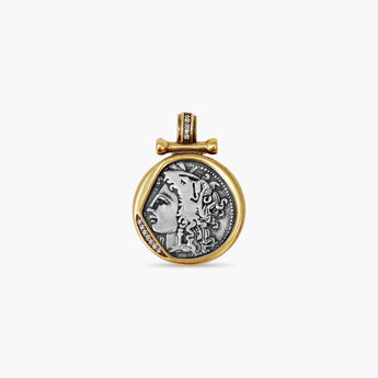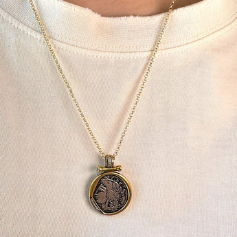 Vintage inspired and effortlessly chic the two tone Goddess Legacy Medallion celebrates the duality of Artemis' divine nature. Contrasting gold and silver tones, mirror the celestial balance of hunter and protector, fierce and nurturing. Let the dual hues symbolize the harmonious interplay of strength and grace that carries you throughout your daily journeys. Brushed antique finish and pave accents on bail and edge. Wear alone or add other Alexie of Athens meaningful hanging charms to add to this story.