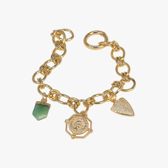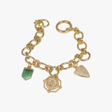 Embrace your divine power with our Prosper Goddess Bracelet, a symbol of strength, abundance, and protection. Crafted with exquisite detail, Our Loop Link Bracelet chain features our Athena charm adorned with a shimmering Averturine Prosperity Crystal and our brilliantly beautiful Pave shield, radiating an aura of empowerment and resilience. Each charm is a testament to your inner strength and the limitless abundance that surrounds you. The Aventurine crystal symbolizes a beacon of wealth and abundance, attracting positive energy and opportunities into your life. Paired with the protective shield charm, it offers a shield of light against negativity and adversity, guiding you towards prosperity and success.