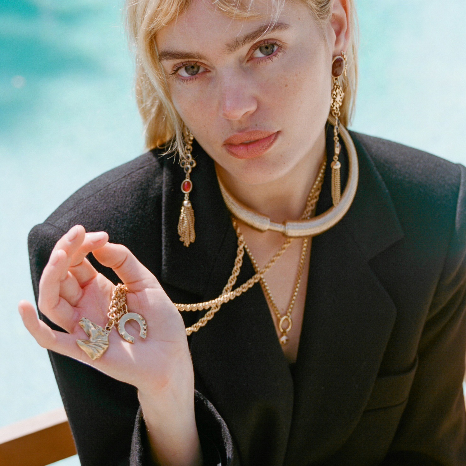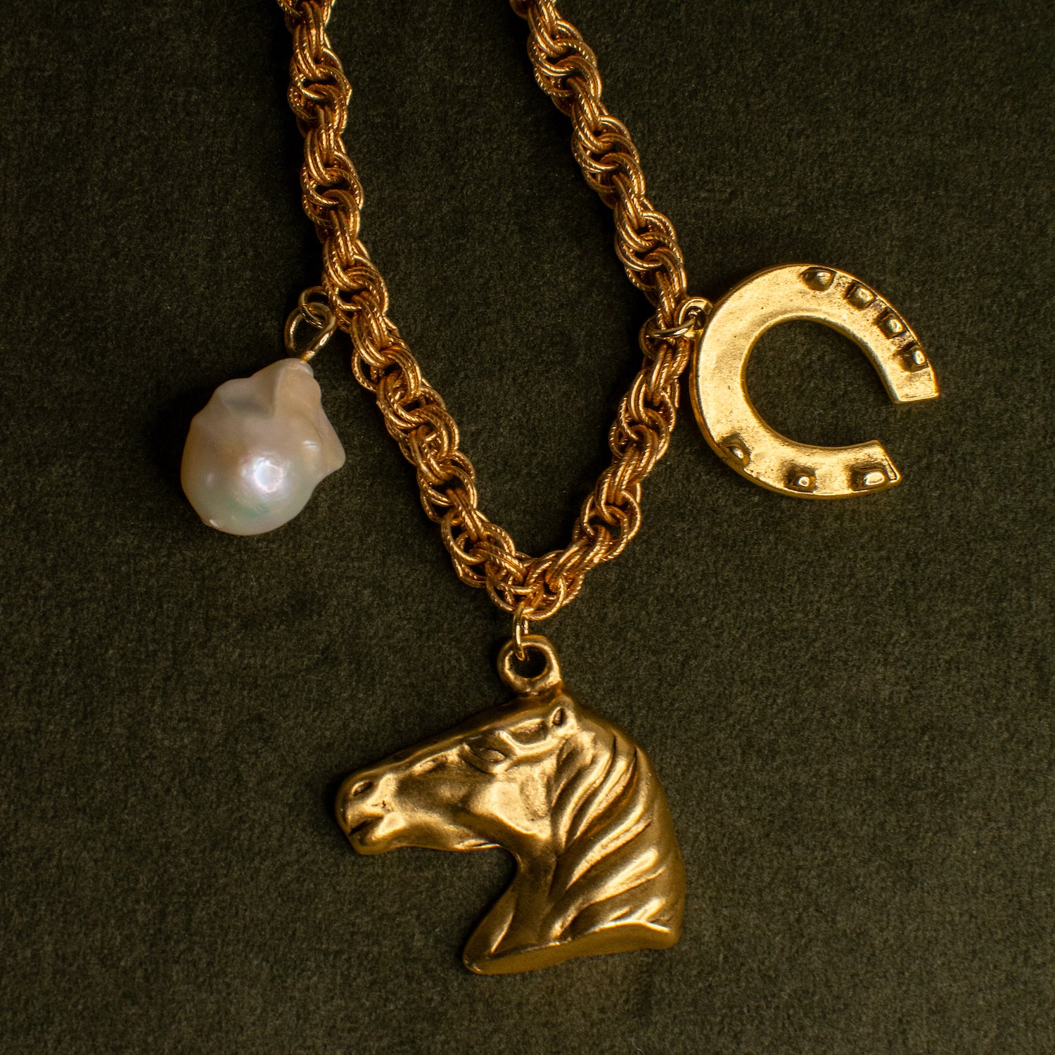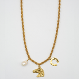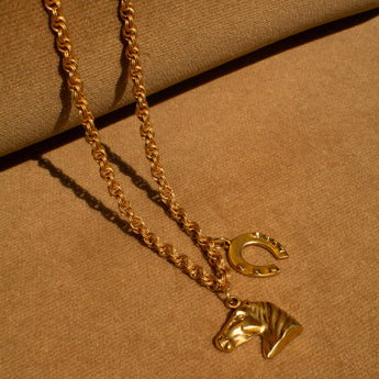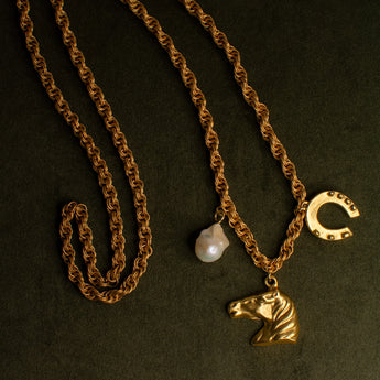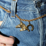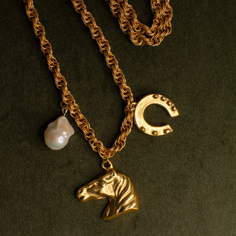 Our Lucky Heirloom Convertible Belt & Necklace Chain features a chunky, vintage-inspired chain anchored by three powerful charms: luminous mother of pearl for intuition and inner wisdom, a sculpted horse head honoring resilience and grace, and a horseshoe—an enduring emblem of luck and protection. Designed to transform, it can be worn low on the hips as a belt or draped as a long necklace. Released in the Year of the Fire Horse, a time associated with bold energy, independence, and forward motion, a modern talisman meant to be worn with intention, strength, and a sense of myth brought into the present.