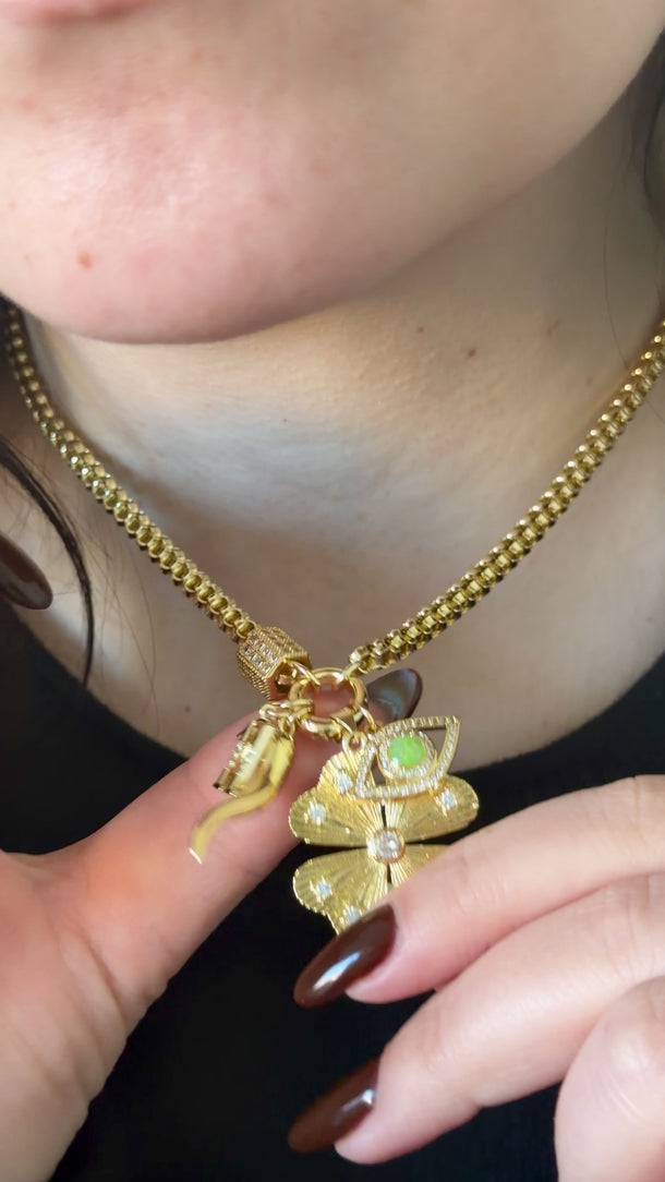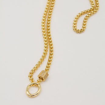 Our Serpentine Bead Charm Chain is the perfect chunky strikes with a striking hexagon pave bead strung a balance between subtle and present. It's the versatile essential in your collection that seamlessly transitions from day to night. It's timeless design allows it to be the perfect canvas for your cherished charms or a statement medallion. Anchored with a oval center charm push clasp perfect for layering in your favorite charms and is removable for use on other chains as well.